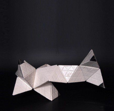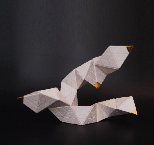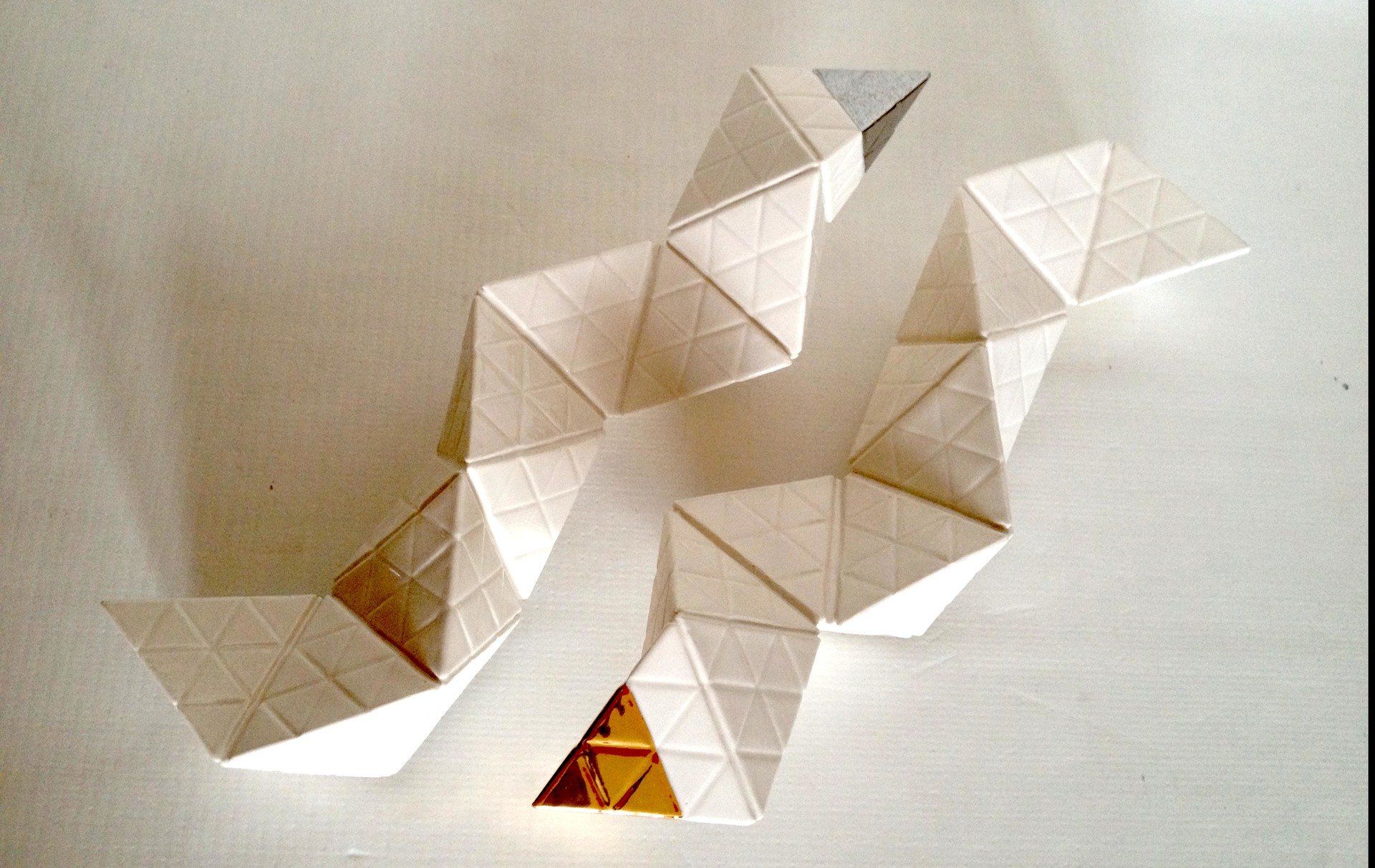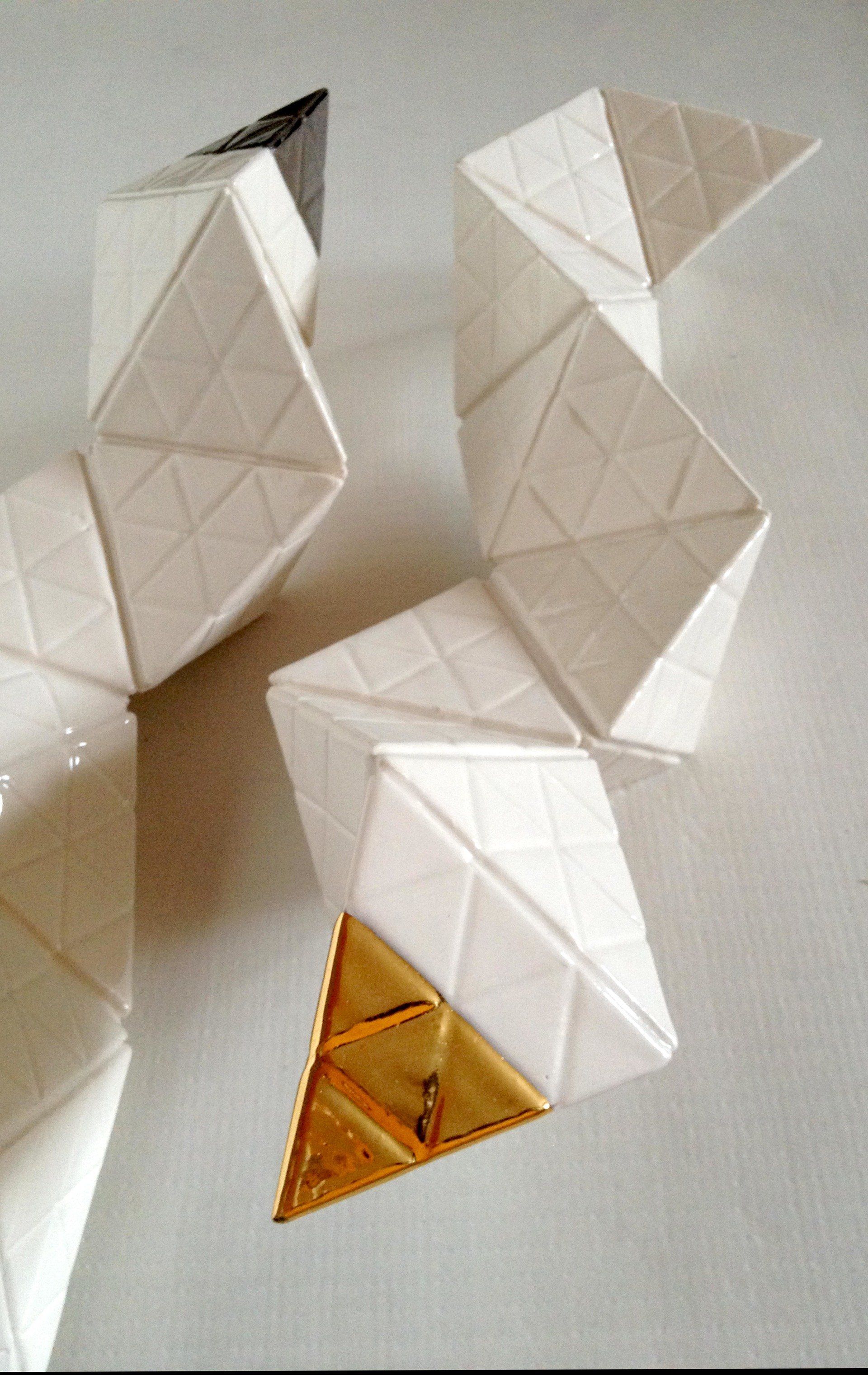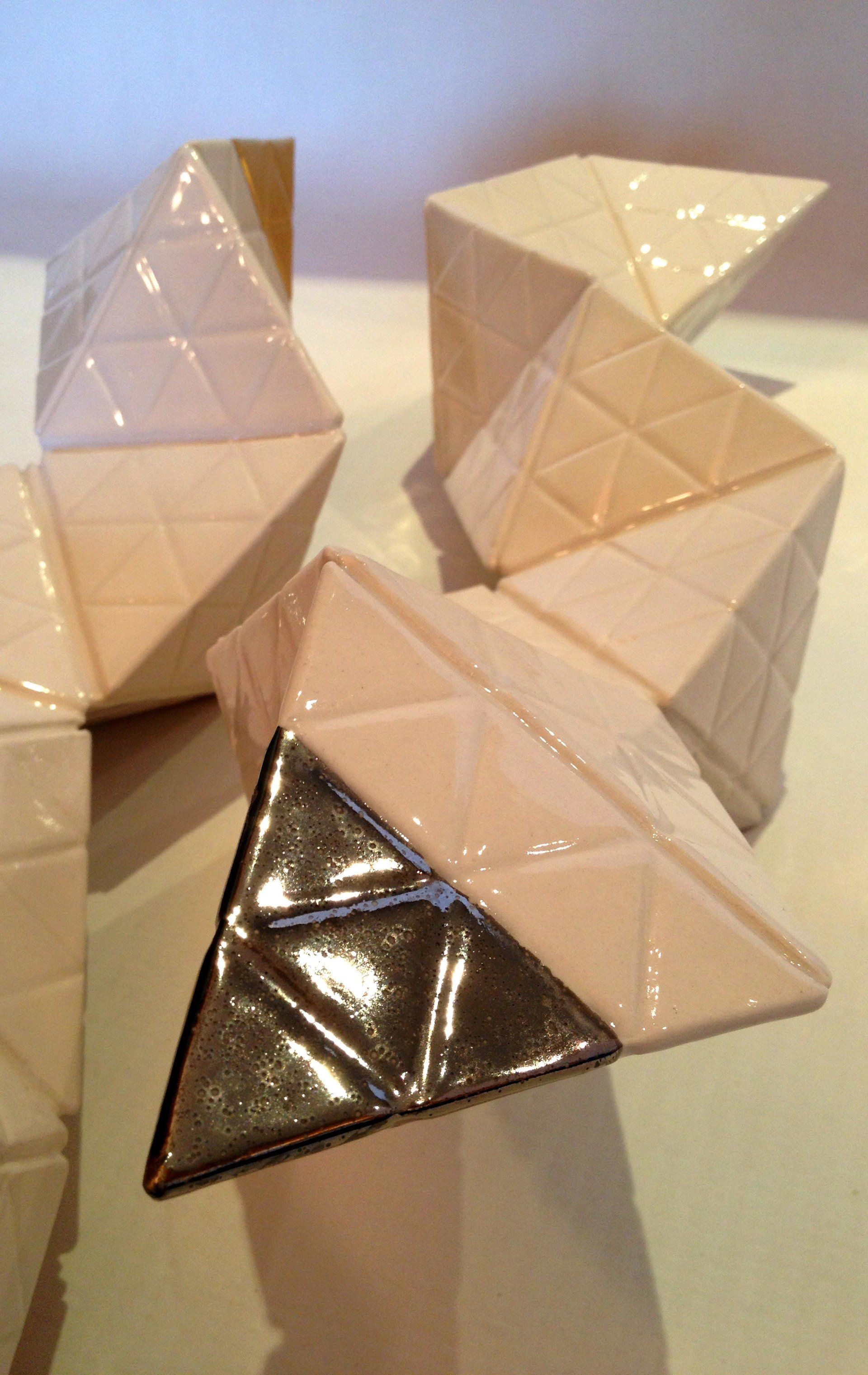Production stages, technique: Slipcasting of Porcelain. Plaster cast of pyramids´s moulds, pouring of Porcelain , Glaze with second glaze-firing at a temperature of about 1,300 °C (2,370 °F) and a Bright Gold & Platinum´s lustre technic with a third firing 800 °C (1,472 °F)