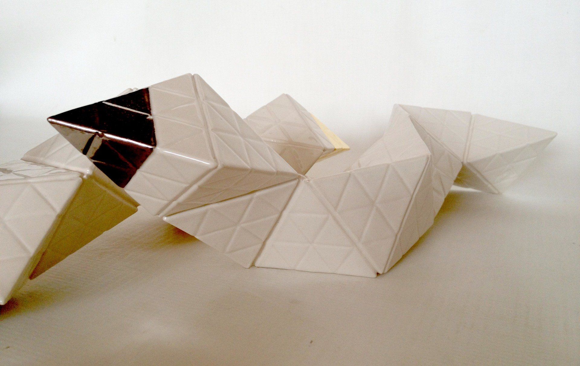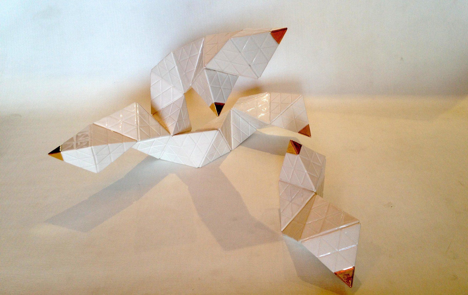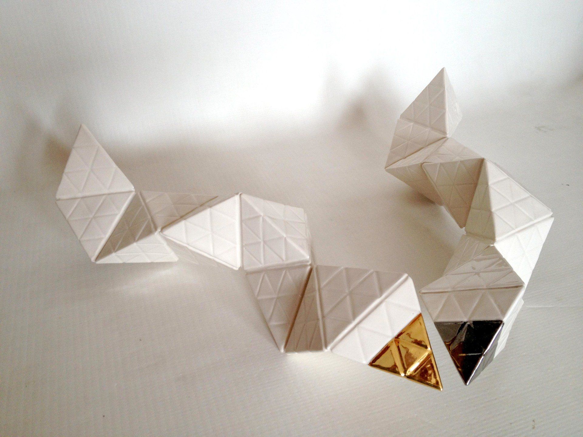 Production stages, technique: Slipcasting of Porcelain. Plaster cast of pyramids´s moulds, pouring of Porcelain , Glaze with second glaze-firing at a temperature of about 1,300 °C (2,370 °F) and a Bright Gold & Platinum´s lustre technic with a third firing 800 °C (1,472 °F)
