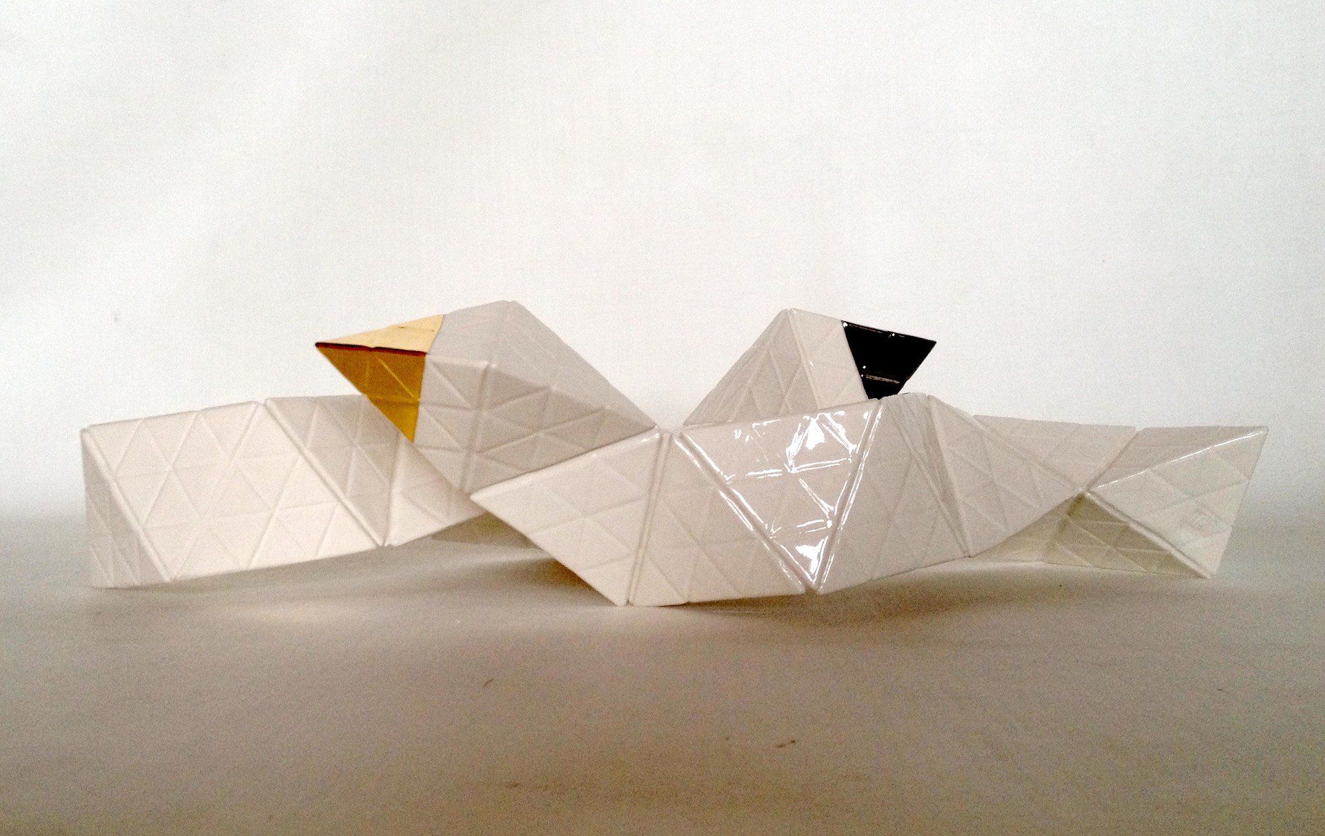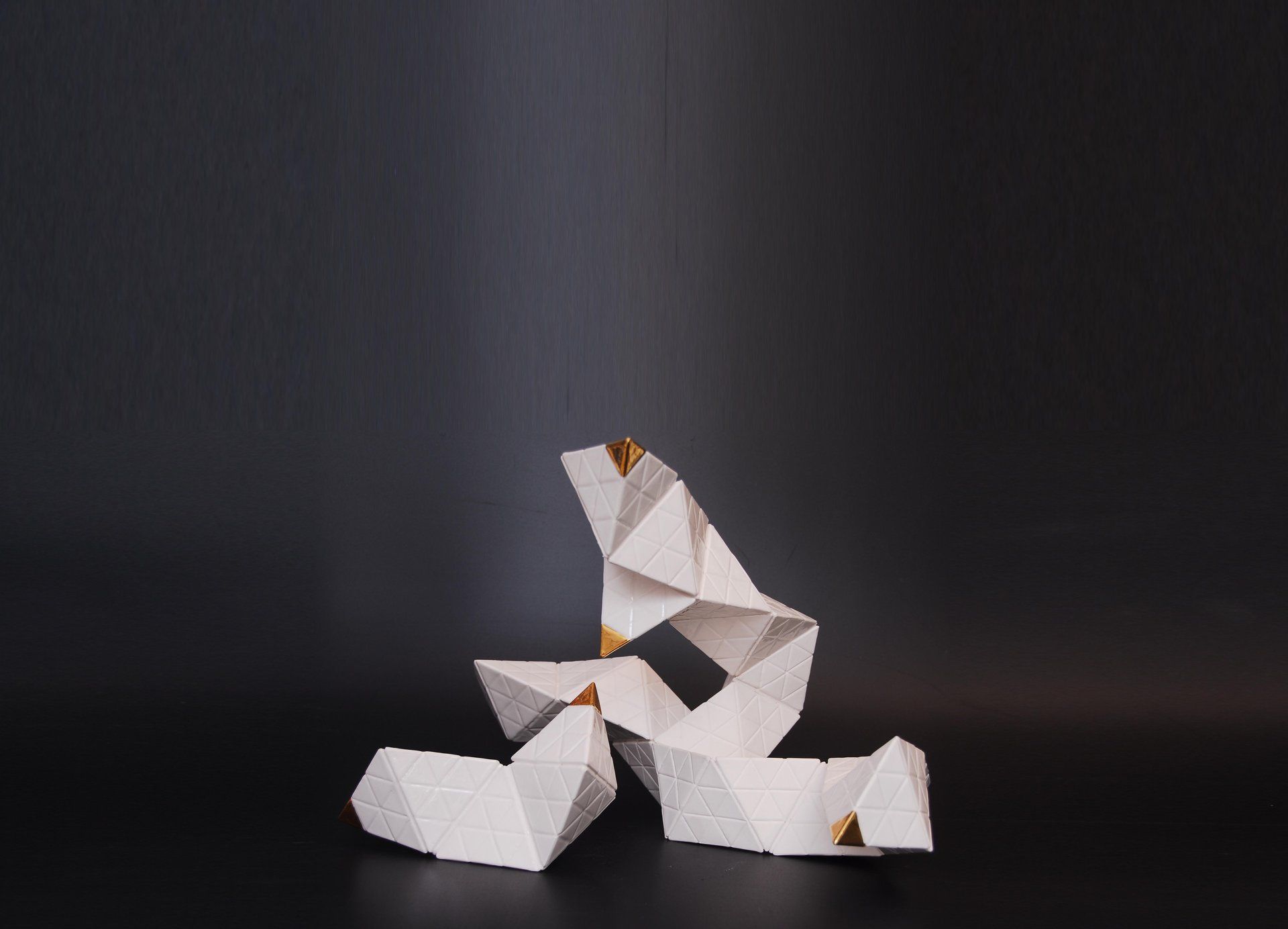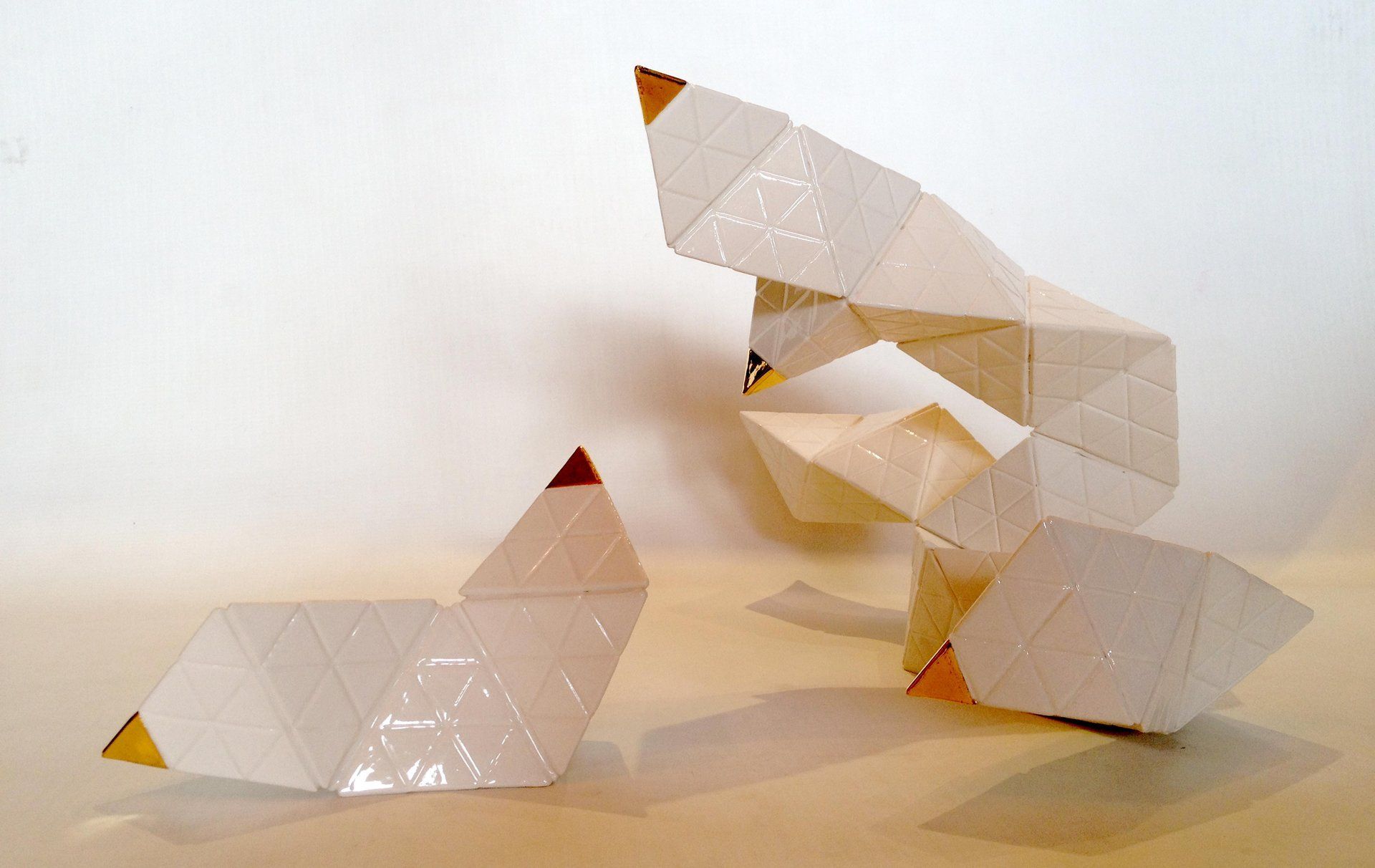 Production stages, technique: Slipcasting of Porcelain. Plaster cast of pyramids´s moulds, pouring of Porcelain , Glaze with second glaze-firing at a temperature of about 1,300 °C (2,370 °F) and a Bright Gold & Platinum´s lustre technic with a third firing 800 °C (1,472 °F)